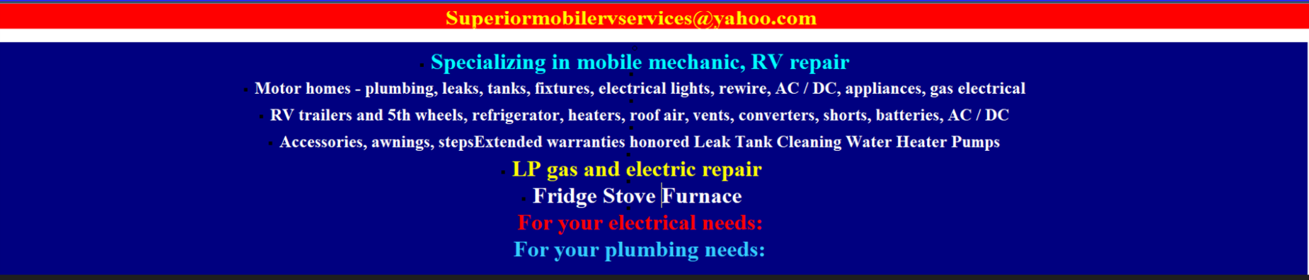 Mobile RV Service & Inspections Mobile RV Service & Inspection We perform mobile RV inspections near San Diego CA, covering Riverside, San Diego, Orange, and San Bernardino Counties. years of experience and San Diego RV Repair & Mobile Service sandiegorvrepai RV Mobile Repair, 24/7 A/C, Fridge, Awnings, , All Types of RV RepairsReasonable Prices Call or Mobile. County RV Service Center | RV Repair | Santee, CA County RV . Repairs completed fast. Highly trained and skilled technicians. RV repairs. RV mechanical. RV body shop. Oil changes. Transmissions repairs. Missing: mobile | Show results with: mobile Mobile RV Repair in San Diego & Orange County CA - Vans ... We provide mobile RV repair services in San Diego, CA, and all across San Diego and Orange County. We come to you and help get your RV back on the road! Mobile RV Repair - San Diego, CA .. › Automotive › RV Repair MOBILE RV REPAIR, San Diego, CA 92021, 23 Photos, Mon -, Mobile RV the best quality mobile rv service in San diego and riverside county. Our Services. We offer qualified service and repairs to all of the House Side of the RV. luisrvsd 80+ followers Mobile RV Repair in San Diego. Expert Service On-the-Go. Keeping RVs Rolling Smoothly. . Serving all San Diego County. RV Repair In San Diego | 100+ 5 Star Reviews | Need RV Repair San Diego? RV Specialists Is A Family Owned, Full Service RV Service Center Located In San Diego. Over 33 Years of Customer Satisfaction! San Diego Mobile RV Repair MapQuest › ... › California › San Diego From minor repairs to complex troubleshooting, San Diego Mobile RV Repair is dedicated to delivering top-notch service to clients in the region. Mobile RV Repair Near You in San diego country estates, ... RV Help ... › California Our certified professionals come to you for diagnostics, emergency fixes, and routine maintenance. Available 7 days a week for all RV types including travel ... People also search for San Diego RV Center RV Pro Mobile Inc. San Diego Ultimate RV RV Repairs and Services LLC Elite RVs RV Select Inc. Feedback Mobile rv repair san diego county near me Mobile rv repair san diego county prices Free mobile rv repair san diego county Best mobile rv repair san diego county Cheap mobile rv repair san diego county Mobile rv repair san diego county cost Mobile RV repair near me Mobile RV Repair El Cajon Results for Los Angeles Orange County Riverside San Bernardino County San Diego Ventura County County, CA ∙ Choose area Businesses All American Mobile RV Repair LRV repair shop 3+ years in business · Venice, CA Open 24 hours · Mobile outfit offering services for RVs, travel trailers, and campers, including repairs and remodeling. Directions Infinite RV Mobile Service & Repair · RV repair shop Brea, CA RV repair shop offering services such as electrical and plumbing work, roof resealing, and more. Website Directions Mobile RV Repair Service 5.0(10) · RV inspection service More businesses Open in Maps TOP 10 BEST Mobile Rv Repair in Los Angeles Orange County Riverside San Bernardino County San Diego Ventura County, CA Automotive Top 10 Best Mobile Rv Repair Near Los Angeles Orange County Riverside San Bernardino County San Diego Ventura County, California · RV Express Mobile Service · Aaron's Mobile RV Service · Mobile Rv Service · Jacks Mobile RV ... THE RV REPAIR Company THE RV REPAIR Company We work on most RV brands and models, including recreational vehicles, vans, diesel pushers, gas engine coaches, bumper pull trailers, and 5th wheel trailers. Mobile RV Repair - Fast Reliable Service Mobile RV ... Mobile RV Repair Home · About · Services · Areas · Contact Us ·4 MOBILE RV REPAIR - Updated ... › Automotive › RV Repair More info about Jims Mobile RV Repair · Map · Los Angeles Orange County Riverside San Bernardino County San Diego Ventura County, CA 91364. Woodland Hills. Directions · Call Now · More Info. Hours · Other Amenities. Does ... People also ask Why is RV repair so expensive? What is the most common RV repair? How much does it cost to repair a camper? Does Camping World fix RVs? Feedback Mobile RV Repair in Los Angeles Orange County Riverside San Bernardino County San Diego Ventura County, CA Interstate Fleet Services trailer-repair › mobile-... Frustrated with unanswered calls, especially in the middle of the night? Save yourself the hassle and contact us at r RV repair in Los Angeles Orange County Riverside San Bernardino County San Diego Ventura County, ... Mobile RV Repair - RV Repair by Custom way in California custom-way. Services We provide our service within a 100-mile radius of our Repair Shop in Los Angeles Orange County Riverside San Bernardino County San Diego Ventura County County. Book Your At-Home RV Repair Today Mobile RV ... RV Maintenance Los Angeles Orange County Riverside San Bernardino County San Diego Ventura County El Toro RV Service rv-maintenance-shop... El Toro RV Service has been Los Angeles Orange County Riverside San Bernardino County San Diego Ventura County' most trusted RV Repair company for over 35 years, always ready to address a wide range of recreational vehicle issues. Mobile RV Repair In Los Angeles Orange County Riverside San Bernardino County San Diego Ventura County County Murphy Mobile RV Repair Service Area We Make RV Repair Convenient & Honest · Certified Mobile Technician — RVTAA certified · Mobile Service Coverage — 50-mile radius from Fullerton, CA · All-in-One ... Burbank California Mobile RV Repair All Class RV RV Roof Repair - RV Repairs - RV Flooring Repair Schedule An Appointment Today To Service Or Repair All RV Needs. Call Us Today. All Class RV Is An Industry Leader In RV & Coach Services & Repairs. Call Us Today. Search Results Mobile Rv Repair near California Any rating Any time A Mike's Mobile Rv Repair and Service RV Repair & Service, Auto repair · Arroyo Grande, CA ·Request a Quote Responds in about 49 minutes Website Website B All American RV Repair RV Repair & Servic